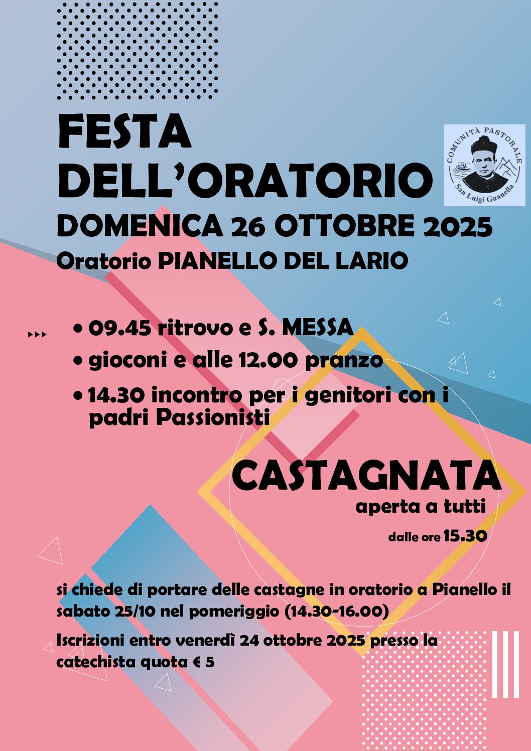 Domenica 26 Ottobre 2025, festa dell’Oratorio, Pianello. 10.00 S. Messa, poi per i bambini e i ragazzi attività, giochi e pranzo in Oratorio. Per i genitori ore 14.30 incontro coi padri Passionisti. A seguire castagnata per tutti.