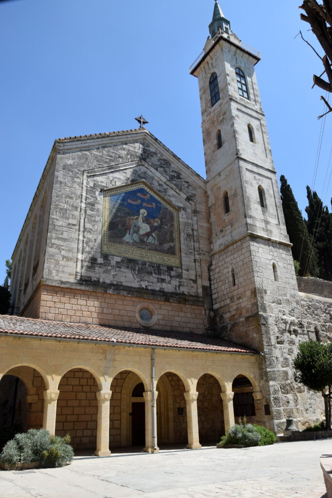 Inglobato nella municipalità di Gerusalemme, si trova il villaggio di Ain Karim (o Ein Karem in ebraico). Qui sorgono due edifici che hanno visto la visita del nostro pellegrinaggio, la chiesa della natività di Giovanni Battista e la chiesa della Visitazione. La prima di queste ricorda la figura del Battista, il Precursore, e viene indicata come la casa di Zaccaria. Nella chiesa, sono presenti numerose rappresentazioni di San Giovanni che costituisce una figura importante nell’economia della vicenda di Gesù. All’esterno della chiesa, sul muro perimetrale, è presente tutta una serie di pannelli che riproducono in varie lingue la preghiera del Benedictus, detto anche il cantico di Zaccaria, che viene usata ogni giorno nella recita delle Lodi. A non molta distanza dalla chiesa del Battista, salendo su una stradina, si giunge alla imponente chiesa della Visitazione. “In quei giorni Maria si mise in viaggio verso la montagna e raggiunse in fretta una città di Giuda” (Lc 1,39). Con queste parole viene indicato come la Vergine si portò da Nazareth verso questo luogo montuoso dove risiedeva la più anziana cugina Elisabetta, che era incinta di Giovanni Battista.