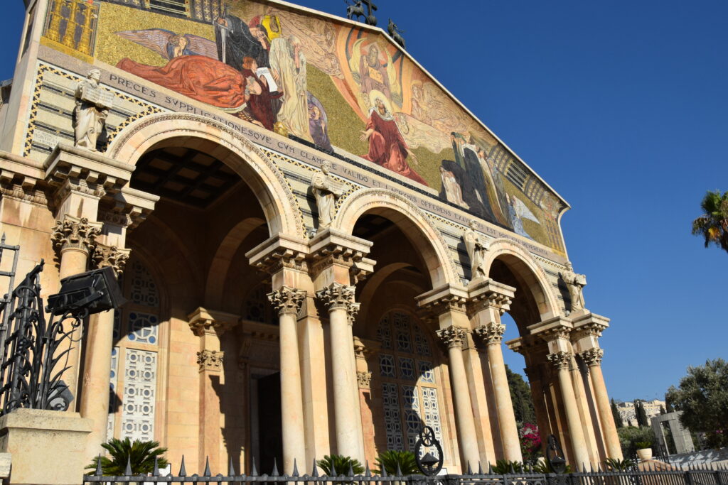 Ai piedi del Monte degli Ulivi c’è la solenne Basilica delle Nazioni che è posta vicino al giardino degli ulivi più noto come Getsemani. Si può passare accanto al terreno pieno di ulivi che è accanto alla basilica. Certamente non sono presenti gli ulivi del tempo di Gesù, ma queste piante, in questo luogo evocano potentemente il momento di preghiera che qui Gesù visse con intensa passione. Anche la basilica, nella sua penombra rievoca questo momento così particolare della vita di Cristo. don Luca