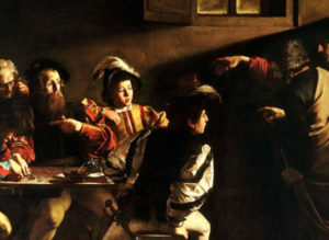 Non tutti gli storici dell’arte sono, però concordi, nel riconoscere Matteo nella figura dell’uomo che indica se stesso. Altri lo identificano con il giovane che conta, a testa bassa, il denaro sparso sul tavolo. Quale che sia la corretta lettura, poco importa. Ciascuno di noi, ammirando questa stupenda immagine, forse potrà sentirsi chiamato personalmente. Anzi, dovrà sentirsi, tra tanti, l’eletto.