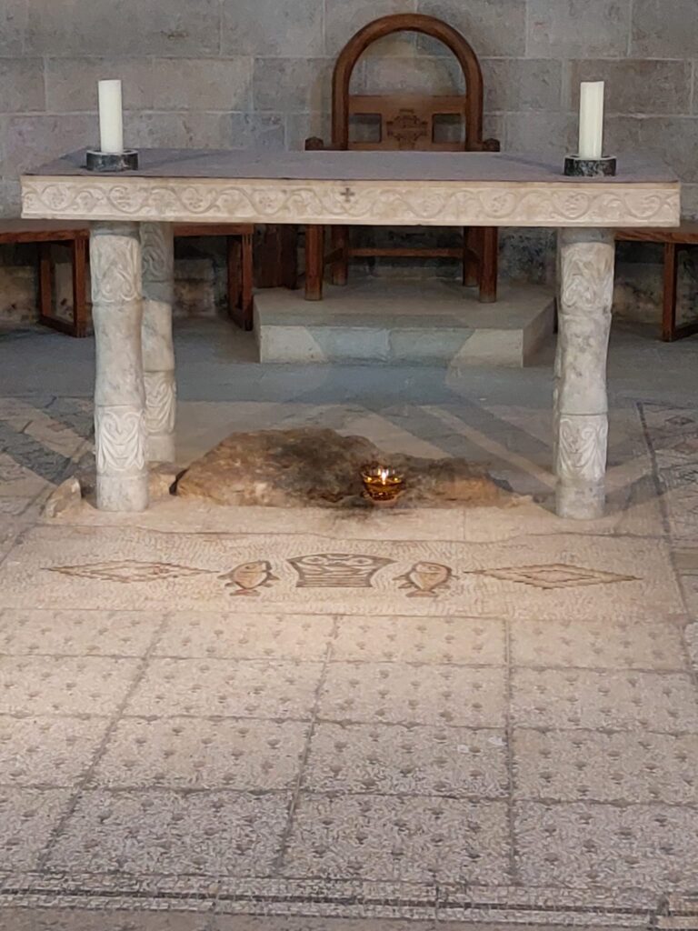 Tabgha e Cafarnao sono due località molto vicine l’una all’altra. Sono collocate sulle sponde del lago di Tiberiade e ci portano nella mente e nel cuore numerosissimi episodi importanti del Vangelo. Tabgha prende nome da un termine greco heptapegon che significa “località delle sette sorgenti”, questo per la presenza di corsi d’acqua. Qui sorge un monastero dei benedettini tedeschi, all’interno del quale è presente la chiesa che ricorda il fatto, qui avvenuto, della moltiplicazione dei pani e dei pesci. Miracolo che è rappresentato in questo edificio da un pregevole mosaico, che raffigura una cesta con quattro pani e due pesci, posto davanti all’altare. I più attenti fra i lettori di questo foglietto e fra i pellegrini che si sono recati in Terra Santa, potranno muovere una fondata obiezione: ma i pani del miracolo non erano cinque? Domanda esatta! Ma allora dov’è il quinto pane? E’ quello che si trova sull’altare, su tutti gli altari, dove si celebra la S. Messa nella quale il pane diventa il Corpo di Cristo. I luoghi della Terra Santa non hanno solo lo scopo di farci vedere dove si sono svolti i fatti evangelici, dandone prova di storicità e verità, ma anche di rendere vivo e presente quello che noi viviamo e crediamo.